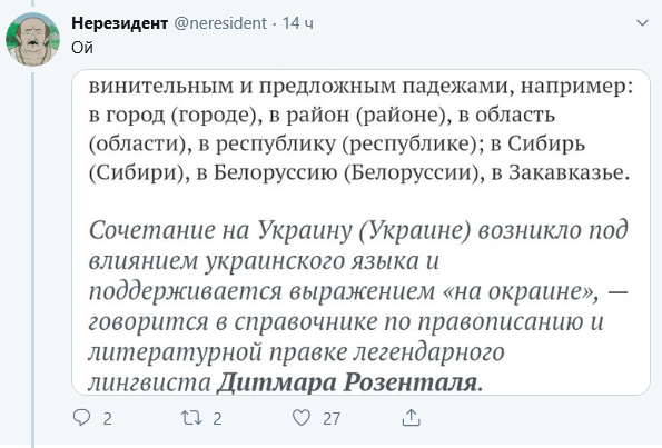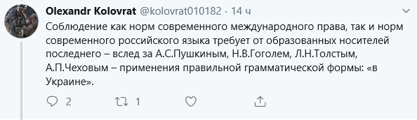 "Вот как раз за нормами русского языка пишется в Украине, а НА Украине пишется только на кремлевско-бурятском языке", - не утихают споры в соцсети. Впрочем, в ветке быстро забыли про "на Украине"/"в Украине" и начали обсуждать "за нормами"/"по нормам".