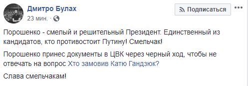"Порошенко - смелый и решительный Президент. Единственный из кандидатов, кто противостоит Путину! Смельчак! Порошенко принес документы в ЦИК через черный ход, чтобы не отвечать на вопрос Хто замовив Катю Гандзюк? Слава смельчакам!" - написал он.