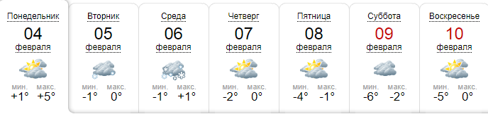 Сайт Gismeteо прогнозирует температуру до +5 в начале недели, которая со вторника постепенно опустится до -2...+1. 5 и 6 февраля возможны осадки в виде дождя и мокрого снега.