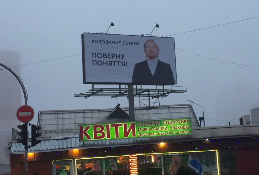 В Киеве появился билборд с изображением Владимира Петрова, политтехнолога и героя секс-скандала, где от его лица обещано "вернуть понятия" (имеются в виду, судя по всему, понятия, по которым живет традиционный уголовный мир, - прим.Ред.).