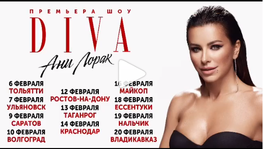 С 6 по 20 февраля у Ани Лорак начнется масштабный тур "Дива" по городам России. Она посетит с концертами Тольяти, Ульяновск, Саратов, Волгоград, Ростов-на-Дону, Таганрог, Краснодар (14 февраля в День Валентина), Майкоп, Ессентуки, Нальчик и Владикавказ.