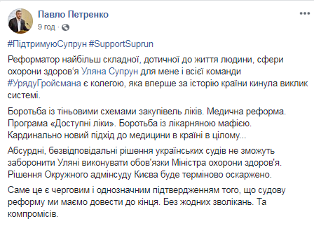 Министр юстиции Павел Петренко возмущен решением суда об отстранении Уляны Супрун с должности и.о. министра здравоохранения Украины и заявил, что оно будет срочно обжаловано. Об этом он написал в своем Facebook.