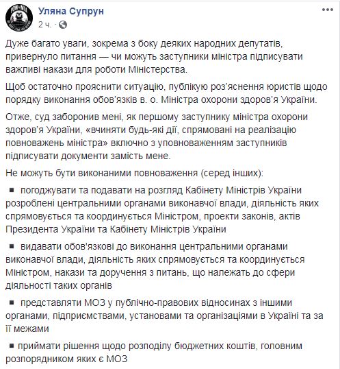 "Суд запретил мне, как первому заместителю министра здравоохранения Украины, "совершать любые действия, направленные на реализацию полномочий министра" включая полномочия заместителей подписывать документы вместо меня", - написала Супрун.