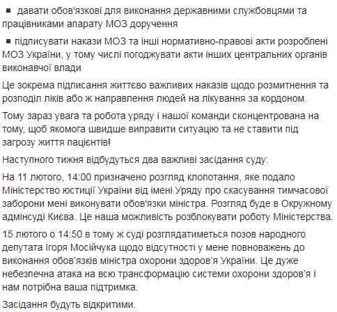 Также она сообщила, что 15 февраля в 14:50 в том же суде будет рассматриваться иск народного депутата Игоря Мосийчука об отсутствии у нее полномочий к исполнению обязанностей министра здравоохранения Украины. "Это очень опасная атака на всю трансформацию системы здравоохранения и нам нужна ваша поддержка", - заявила Супрун.