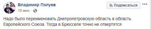 "Надо было переименовать Днепропетровскую область в область Европейского Союза. Тогда в Брюсселе точно не отвертятся", - посоветовал журналист Владимир Полуев.