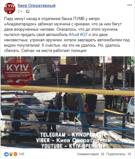 Очевидцы сообщили, что инцидент произошел около 14:20. В отделение банка ПУМБ возле станции метро забежал мужчина. Он кричал, что за ним гонятся неизвестные. Выяснилось, что потерпевший продавал свою машину Audi Q7, а двое, которые назвались покупателями, принесли на встречу оружие. Они попытались завладеть автомобилем, но им это не удалось.