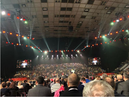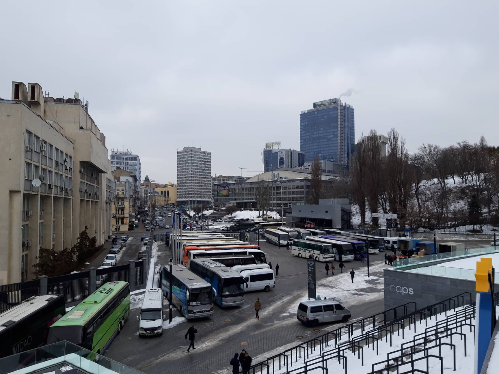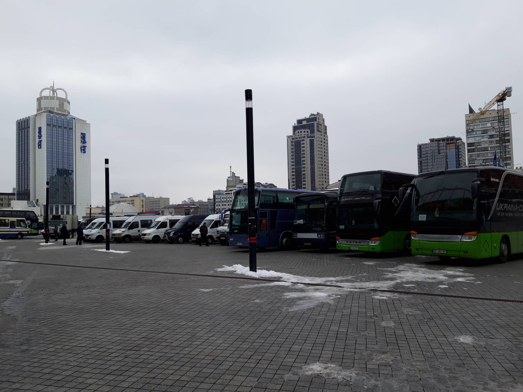 13:10 Появились панорамные фото у Дворца Спорта. С высокой точки видно количество автобусов, которые привезли людей на форум Петра Порошенко.
