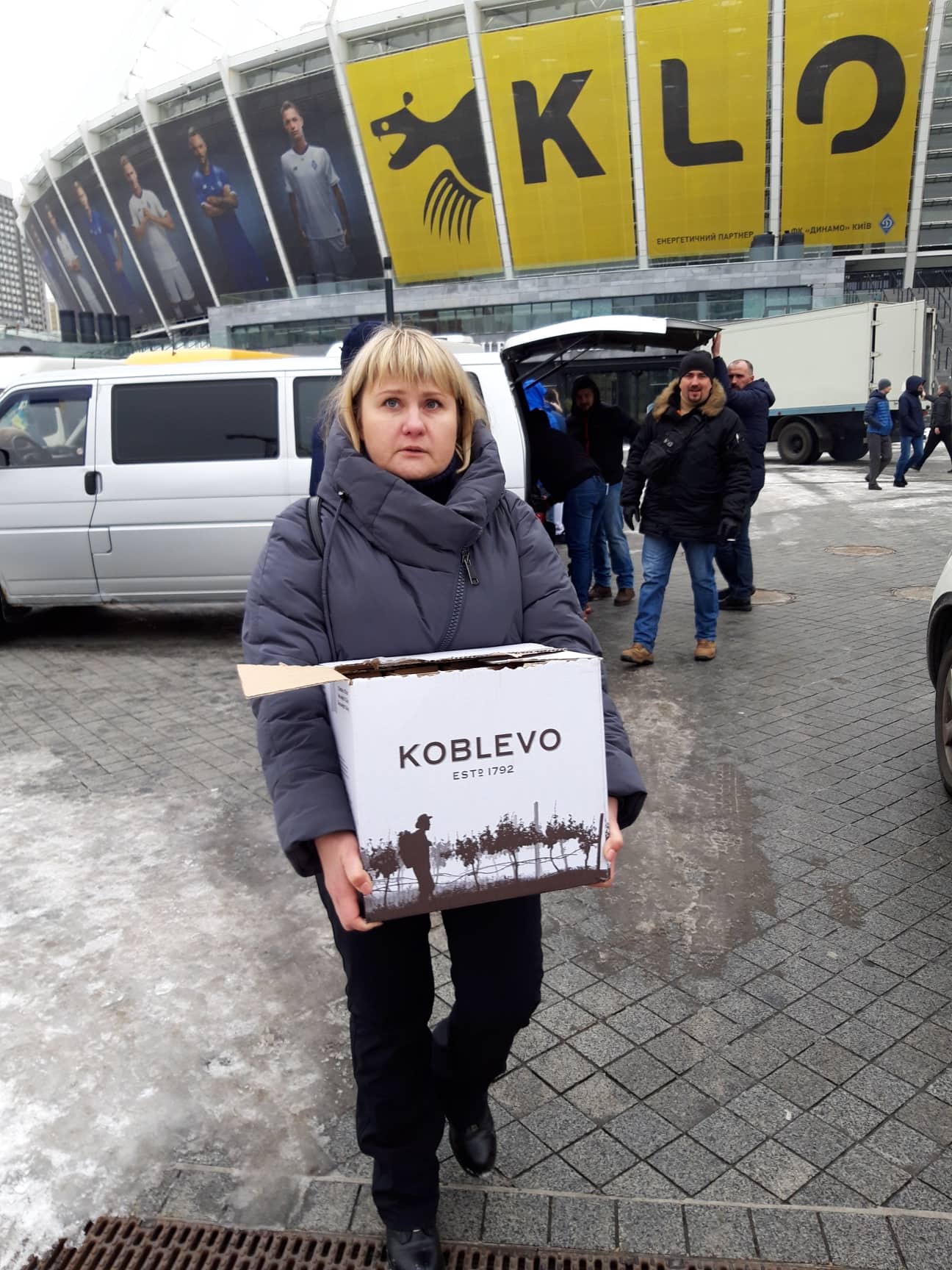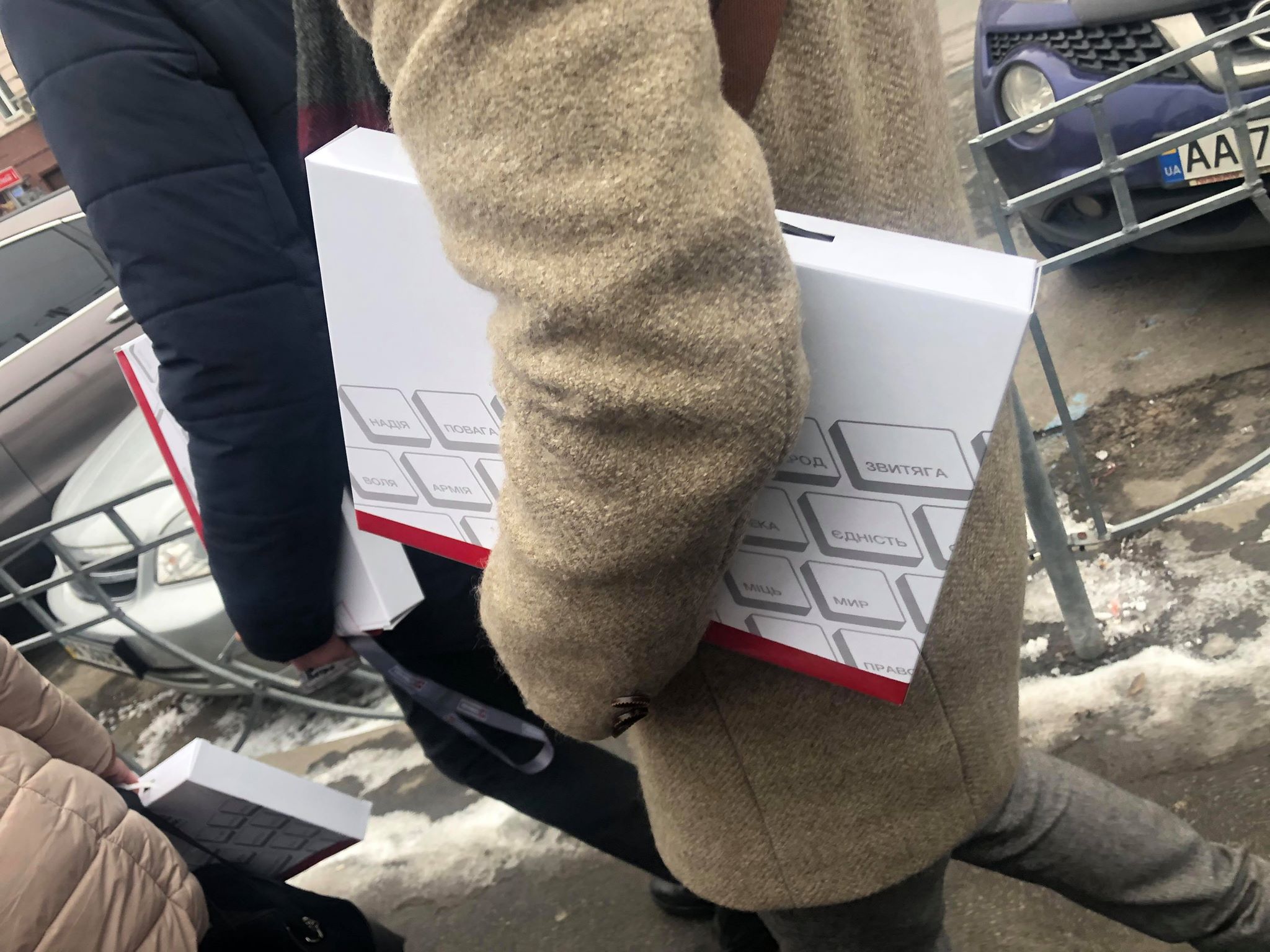 В этих же коробках портреты Порошенко в бумажной рамке, чтобы ставить на стол. Однако люди почему-то стыдливо прячут содержимое пакетов, в которых еще флаг на пластиковой ножке.