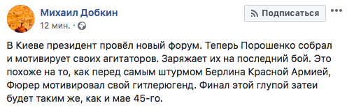 "В Киеве президент провел новый форум. Теперь Порошенко собрал и мотивирует своих агитаторов. Заряжает их на последний бой. Это похоже на то, как перед самым штурмом Берлина Красной Армией, Фюрер мотивировал свой гитлерюгенд. Финал этой глупой затеи будет таким же, как и мае 45-го".