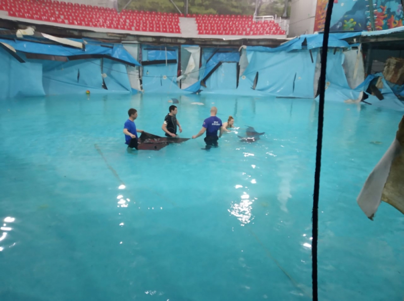 Из-за ЧП вода со стеклами и зрительскими креслами оказалась на улице. Спасателям пришлось срочно эвакуировать двух дельфинов.