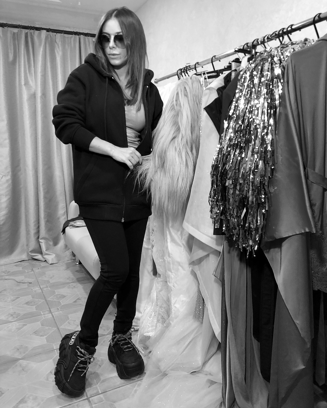 Артистка опубликовала фото на фоне концертных нарядов в темном спортивном костюме и массивных кроссовках на платформе. Сам снимок был черно-белым. Глаза артистка спрятала за большими солнцезащитными очками.