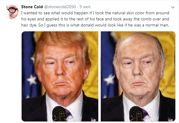 По словам пользователя, ему стало интересно, как бы выглядел Трамп с натуральным цветом кожи, без укладки и с неокрашенными волосами. Для этого он изменил цвет лица американского лидера, взяв за образец оттенок кожи вокруг глаз.