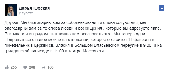 В церкви святого Власия в Большом Власьевском переулке в 08.00 по киевскому времени началось отпевание. А в 10.00 по Киеву в театре Моссовета начнется гражданская панихида.