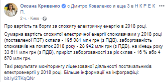 33,6 миллиона гривен составляет задолженность потребителей за электроэнергию, поставленную поставщиками на закрепленные территории по состоянию на конец 2018 года. Об этом во вторник, 12 февраля, на своей странице в соцсети Facebook сообщила глава Национальной комиссии, осуществляющей регулирование в сфере энергетики и коммунальных услуг, Оксана Кривенко.