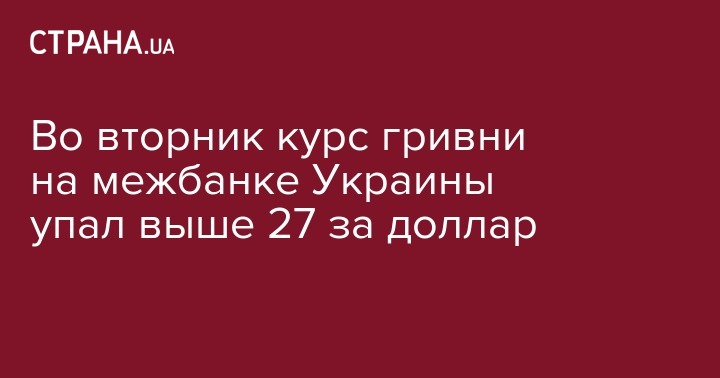 Во вторник, 12 февраля, курс гривни на межбанковском валютном рынке упал до 27,09 грн/$1 с 27,06 грн/$1 в предыдущий рабочий день, передает "Интерфакс-Украина", ссылаясь на дилеров коммерческих банков.