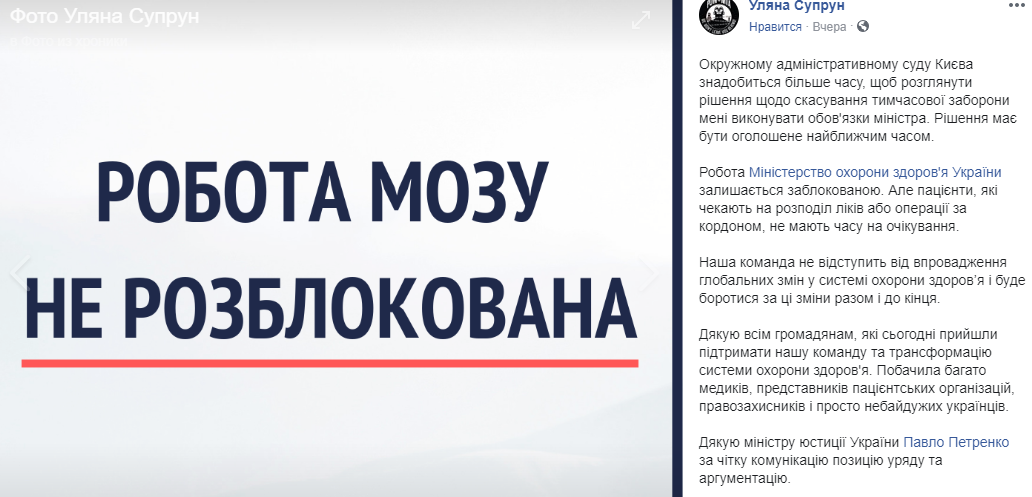 Как сообщала "Страна", 5 февраля Окружной административный суд Киева по иску нардепа от Радикальной партии Игоря Мосийчука запретил Ульяне Супрун выполнять обязанности министра здравоохранения в ближайшие три года.