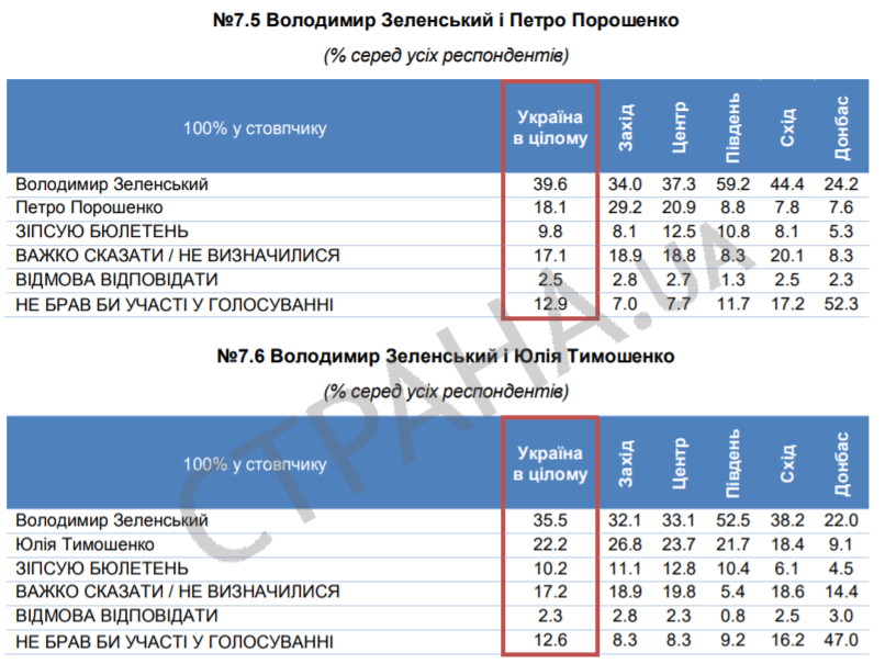 Во втором туре Зеленский также побеждает и Тимошенко, и Порошенко. Последнего - с более чем 20%-м отрывом.