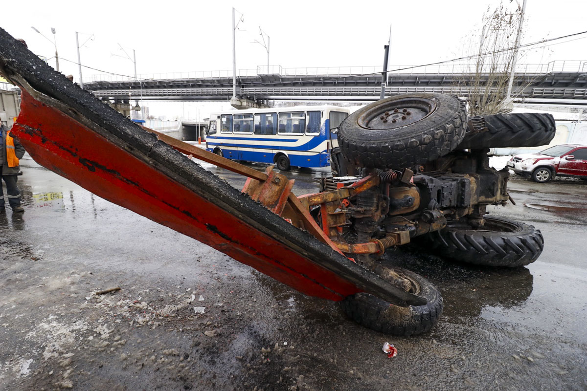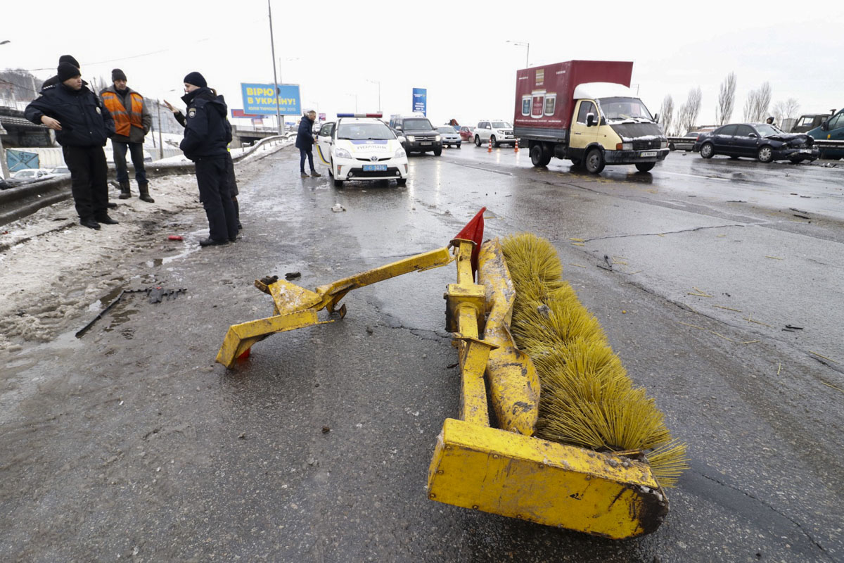 В Киеве грузовик въехал в трактор "Киевавтодора" и снес его с моста. Фото и видео