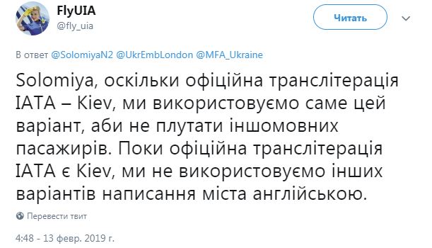 "Мы используем именно этот вариант, чтобы не путать иностранных пассажиров. Пока официальная транслитерация IATA – Kiev, мы не используем других вариантов написания города на английском", - говорится в сообщении компании в Twitter.
