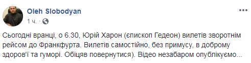 "Сегодня утром в 06:30 Юрий Харон (епископ Гедеон) вылетел обратным рейсом во Франкфурт. Вылетел самостоятельно, без принуждения, в добром здравии и настроении. Обещал вернуться", - написал Слободян.