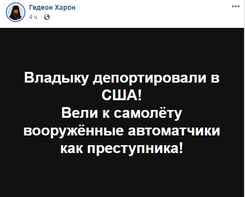 В то же время на странице Харона в Facebook появилось сообщение, "что владыку депортировали в США". "Вели к самолету вооруженные автоматчики, как преступника", - говорится в сообщении.