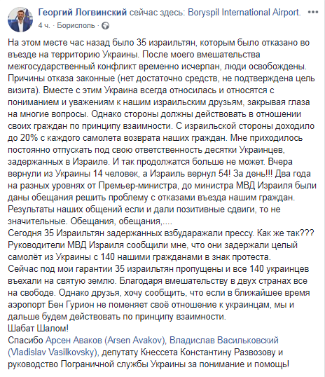 По словам депутата, в настоящее время граждане с обеих сторон освобождены и пропущены в страну назначения, однако межгосударственный конфликт длится не первый день. По словам Логвинского, до 20% украинцам в Израиле отказывают во въезде.