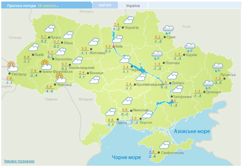 Похожая температура будет и в центральных регионах, однако ночами температура будет держаться на отметке -1+1 градусов. Погода будет пасмурной. На юге страны прогнозируется тепло в районе +4+6 градусов, ночами похолодает минимум до -3. В северных областях также будет пасмурно. Температура днем +3+5, ночью 0-2. В Киеве сегодня будет пасмурно, но без осадков. Температура днем +3+5, ночью около ноля.