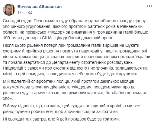 В пятницу, 15 февраля, Печерский районный суд Киева избрал ровенскому криминальному авторитету по прозвищу "Федор", которого подозревают в вымогательстве, меру пресечения в виде круглосуточного домашнего ареста. Об этом сообщил первый заместитель главы Национальной полиции Вячеслав Аброськин на своей странице в Facebook.