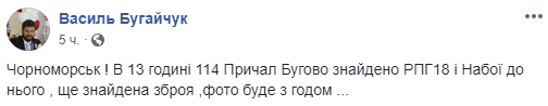В Черноморске Одесской области на побережье у 114 причала обнаружили два заряженных гранатомета РПГ-18. Об этом сообщает депутат Черноморского горсовета Василий Бугайчук в Facebook.