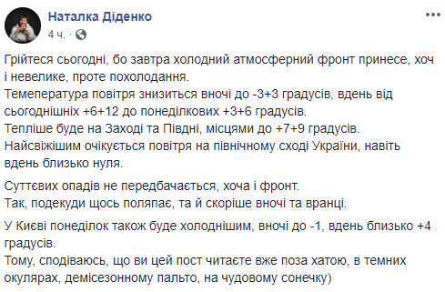 "Грейтесь сегодня, потому что завтра холодный атмосферный фронт принесет, хоть и небольшое, но похолодание. Температура воздуха снизится ночью до -3 + 3 градусов, днем от сегодняшних + 6 + 12 до понедельничных + 3 + 6 градусов", - отметила метеоролог.