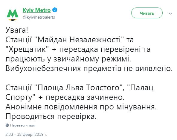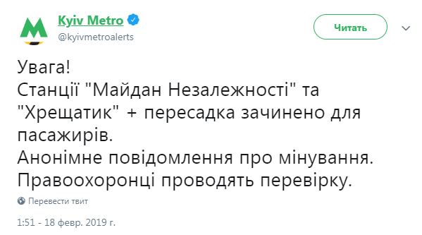 Сначала были закрыты Cтанции "Майдан Независимости" и "Крещатик". "Внимание! Станции "Майдан Независимости" и "Крещатик" + пересадка закрыты для пассажиров. Анонимный звонок о минировании. Правоохранители проводят проверку", - пишет пресс-служба подземки.