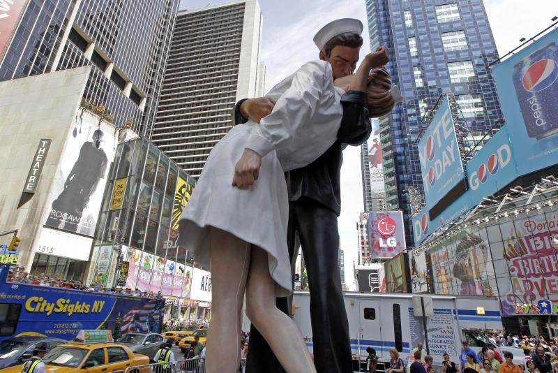 Теперь на месте этого поцелуя стоит скульптура целующейся парочки.