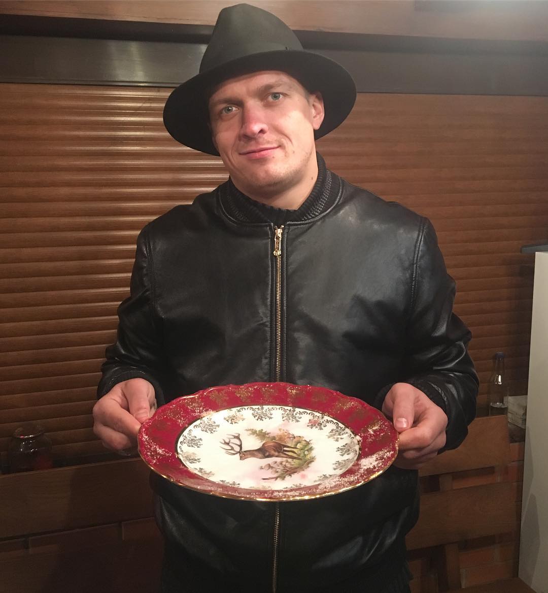 Появилось фото, как украинский боксер Усик в кожаной куртке и шляпе съел полную тарелку вареников