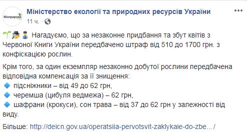 В ведомстве отметили, что за незаконное приобретение и сбыт цветов из Красной Книги Украины предусмотрен штраф от 510 до 1700 гривен с конфискацией растений. "Кроме того, за один экземпляр незаконно добытого растения предусмотрена соответствующая компенсация за ее уничтожение: подснежники – от 49 до 62 гривен, черемша (лук медвежий) – 62 гривни, шафраны (крокусы), сон трава – от 37 до 62 гривен в зависимости от вида", – сообщили в Минэкологии. По данным Минприроды, ежегодно в Украине за сезон уничтожают 20 миллионов первоцветов.