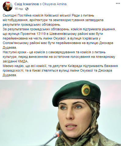Следующие шаги - это комиссия по самоуправлению и комиссия по вопросам культуры, перед вынесением окончательного голосования на пленарном заседании КГГА. Надеемся, что все комиссии, и депутаты Киеврады поддержат желание общественности, и в Киеве появятся улицы Амины Окуевой и Джохара Дудаева", - написал Саид Исмагилов.