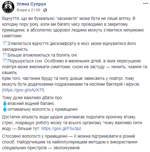 "Желательная относительная влажность в помещении - 40-60%. При более высоких значениях может возрастать риск развития грибков, при более низкой - развиваются перечисленные выше симптомы", - пишет чиновница в Facebook.