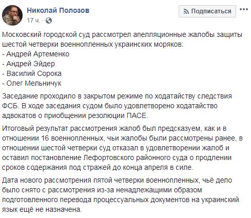 "Московский городской суд рассмотрел апелляционные жалобы защиты шестой четверки военнопленных украинских моряков - это Андрей Артеменко, Андрей Эйдер, Василий Сорока, Олег Мельничук. Итоговый результат рассмотрения жалоб был предсказуем, как и в отношении 16 военнопленных, чьи жалобы были рассмотрены ранее. В отношении шестой четверки суд отказал в удовлетворении жалоб и оставил постановление Лефортовского районного суда о продлении сроков содержания под стражей до конца апреля в силе", - отметил Полозов. Он добавил, что по ходатайству ФСБ заседание проходило в закрытом режиме.