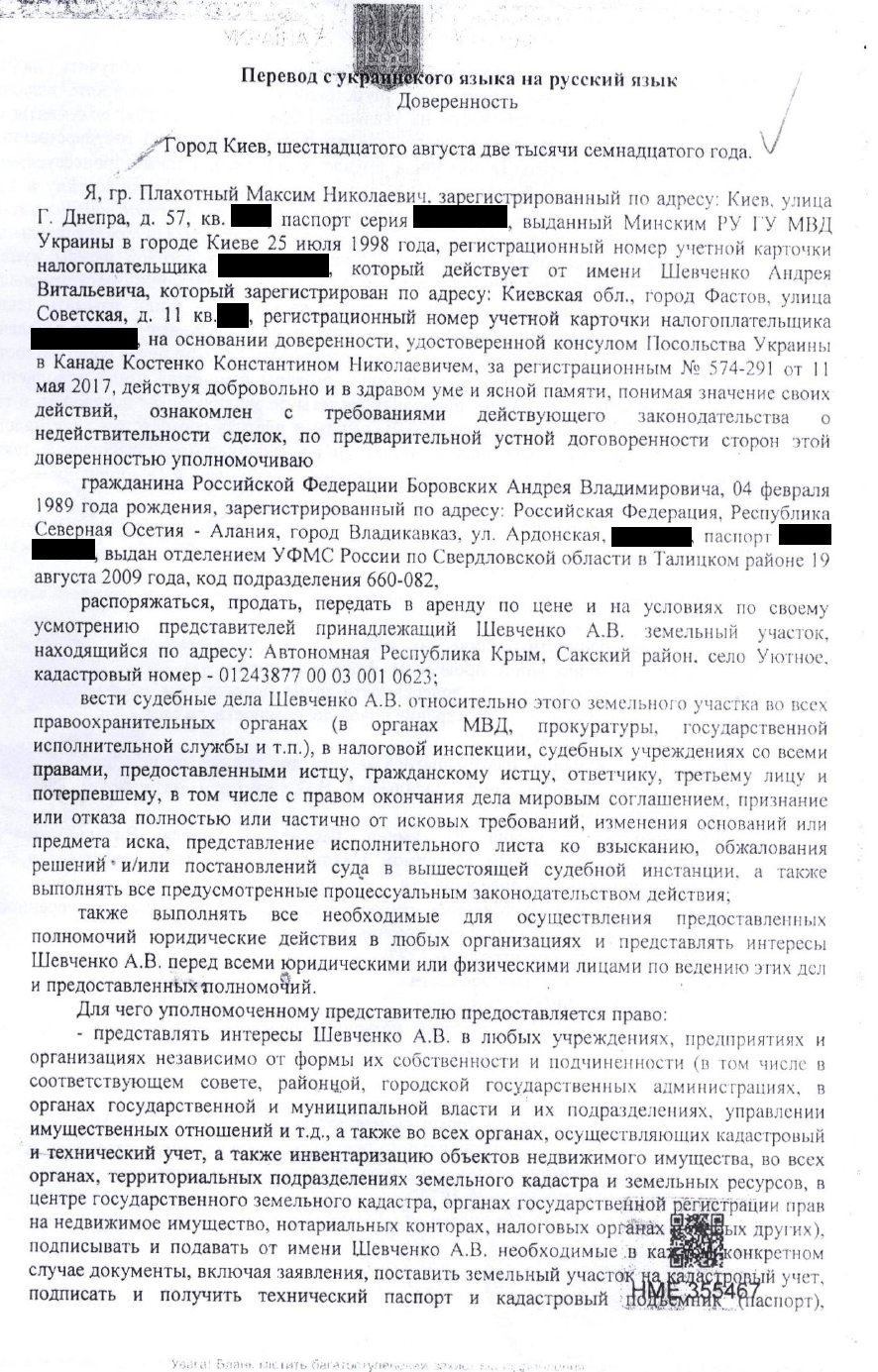 !Совокупность этих факторов и опубликованные документы доказывают, что подписывая доверенность именно на этот участок земли и уполномочивая на такую сделку своего персонального помощника в 2017 году, через три года после аннексии, Посол Шевченко действовал умышленно, организованной группой и из корыстных побуждений, точно зная, что в оккупированном Крыму такие сделки проводят российские нотариусы, по российским законам, в российских кадастрах и с платежами в российский бюджет", - считает Портнов.