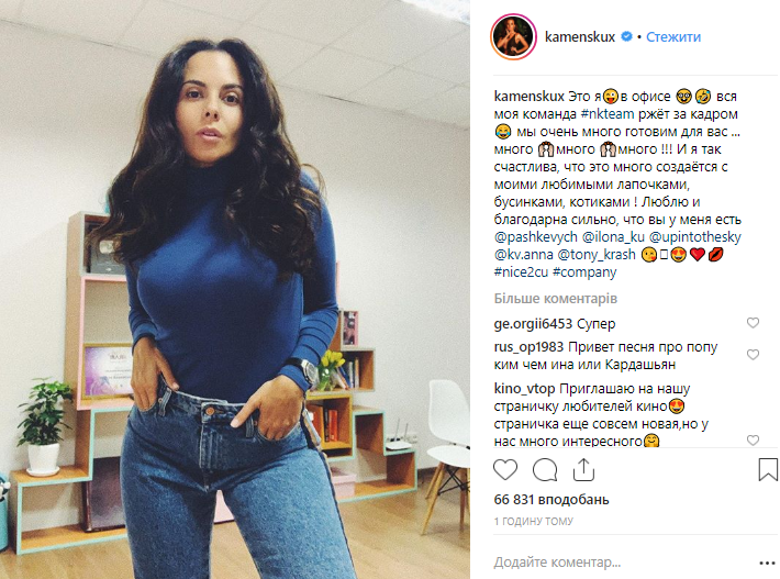Певица Настя Каменских опубликовала фото, которое, по ее словам, она сделал в офисе. Украинская поп-дива позировала в обтягивающем гольфе и джинсах, выгодно подчеркивающих ее формы. При этом она пыталась предстать перед поклонниками в деловом виде, уточнив, что вся ее команда "ржет за кадром".