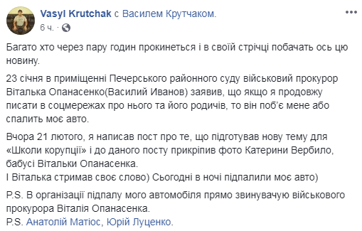 "23 января в помещении Печерского районного суда военный прокурор Виталька Опанасенко (Василий Иванов) заявил, что если я продолжу писать в соцсетях о нем и его родственниках, то он побьет меня или сожжет мое авто. Вчера 21 февраля, я написал пост о том, что подготовил новую тему для Школы коррупции и к данному посту прикрепил фото Екатерины Вербило, бабушки Виталика Опанасенко", - говорится на Facebook-странице Крутчака. Запись опубликована утром в пятницу, 22 февраля.