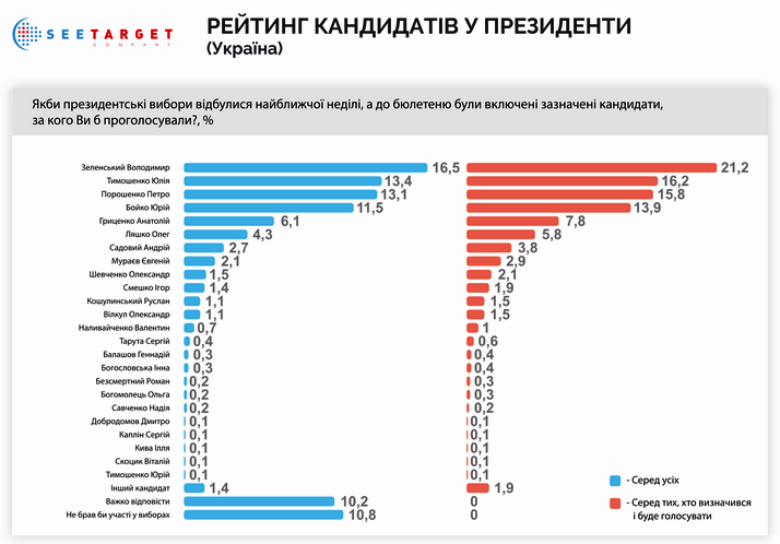 В другом опросе, проведенном компанией Seetarget, первое место также занимает Владимир Зеленский. однако его отрыв более значительный. Второе место за лидером ВО "Батькивщина" Юлией Тимошенко. Петр Порошенко лишь на третьем месте, причем с небольшим отрывом (менее 2 процентов) от него идет Юрий Бойко.