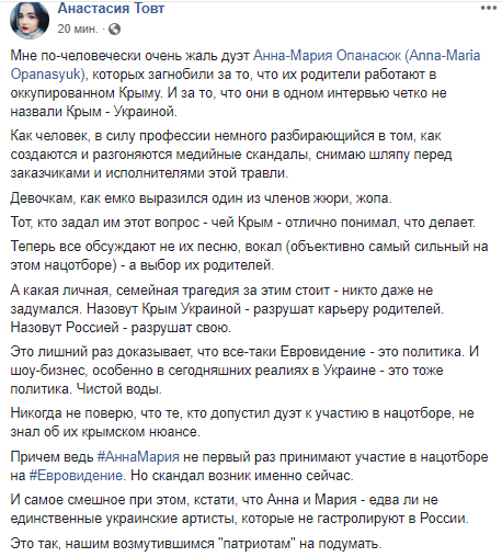 "Мне по-человечески очень жаль дуэт Анна-Мария Опанасюк (Anna-Maria Opanasyuk), которых загнобили за то, что их родители работают в оккупированном Крыму. И за то, что они в одном интервью четко не назвали Крым - Украиной.
