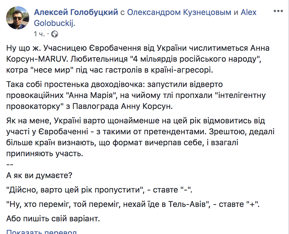 "Ну что ж. Участницей Евровидения от Украины числится Анна Корсун – MARUV. Любительница "4 миллиардов российского народа", которая "несет мир" во время гастролей в стране-агрессоре", – написал политолог Алексей Голобуцкий.