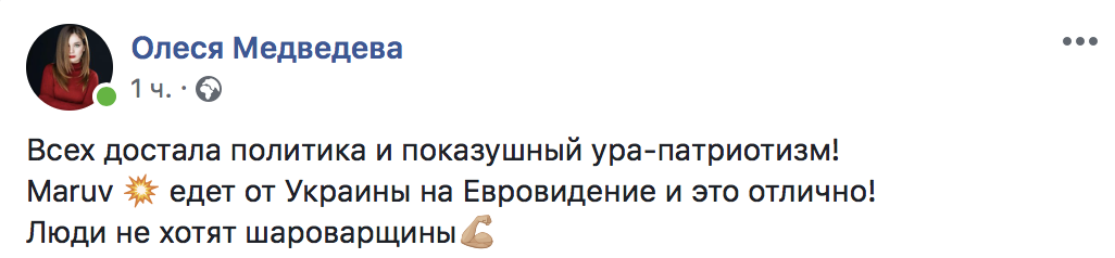 "Всех достала политика и показушный ура-патриотизм! Maruv едет от Украины на Евровидение, и это отлично! Люди не хотят шароварщины".