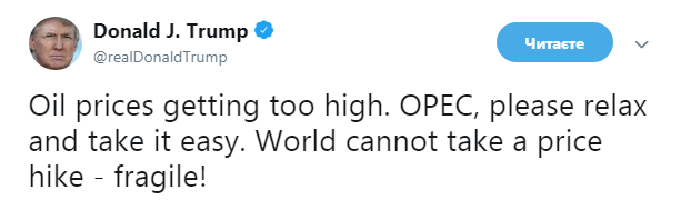 "Цены на нефть растут слишком сильно. ОПЕК (Организация стран-экспортеров нефти - прим. ред.), расслабься. Мир слишком хрупок, чтобы вынести такие ценовые скачки", - говорится в публикации Трампа.