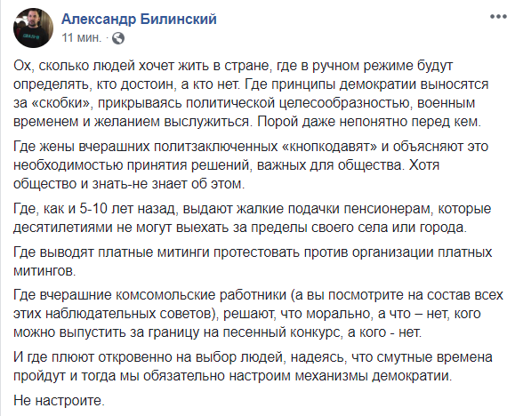 "Ох, сколько людей хочет жить в стране, где в ручном режиме будут определять, кто достоин, а кто нет. Где принципы демократии выносятся за "скобки", прикрываясь политической целесообразностью, военным временем и желанием выслужиться. Порой даже непонятно перед кем.