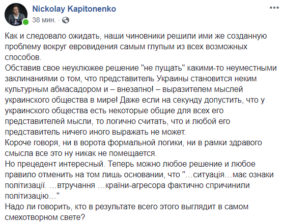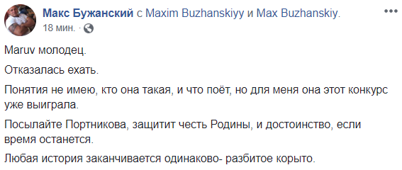 Именно он еще до финала Нацотбора заявил, что против участия в нем тех, кто ездил на гастроли "в страну-агрессор". А после того, как победила Maruv, он многозначительно намекнул, что ее победа не предопределена.