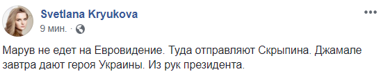 "Марув не едет на Евровидение. Туда отправляют Скрыпина. Джамале завтра дают героя Украины. Из рук президента", - иронизирует заместитель главного редактора "Страны" Светлана Крюкова.