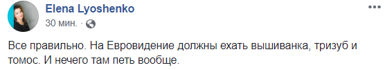 "Все правильно. На Евровидение должны ехать вышиванка, тризуб и томос. И нечего там петь вообще", - считает адвокат Елена Лёшенко.