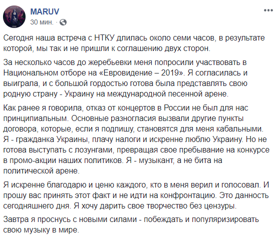 "Продолжительные и изнурительные переговоры (пять с половиной часов) между НОТУ и командой исполнительницы MARUV принесли следующий результат: стороны к согласию не пришли, соглашение подписано не будет", - заявил оню